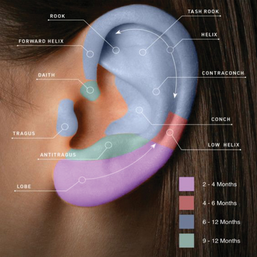 • Tragus/Conch/Other Cartilage: 6–9 months