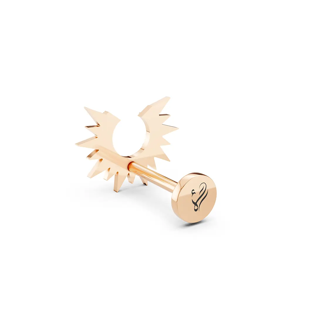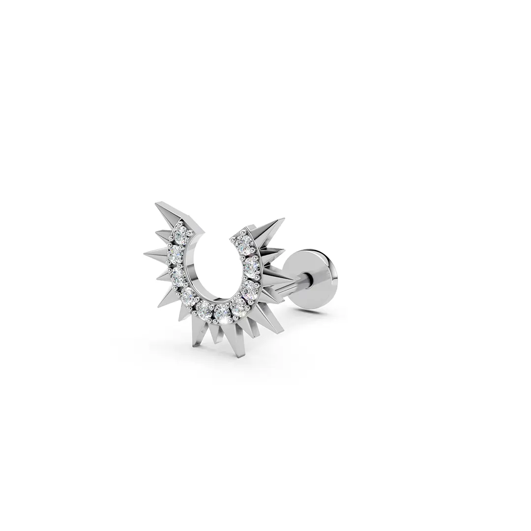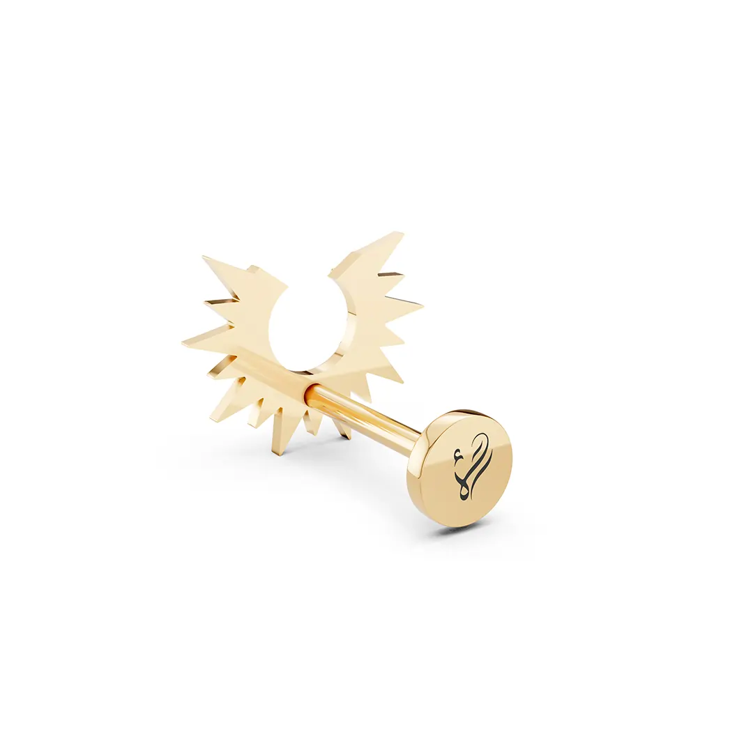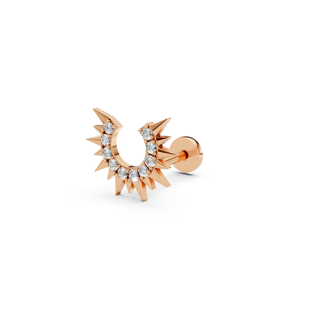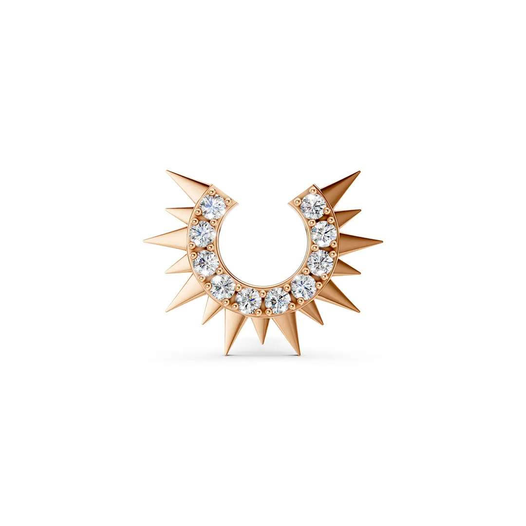 These half-sun earrings feature a dazzling diamond nestled at the core, with finely crafted rays radiating outward in a graceful arc. The asymmetrical design captures the essence of dawn or dusk, symbolizing new beginnings and quiet strength. The diamond’s sparkle adds a touch of brilliance, while the delicate rays provide an artistic, modern twist. Perfect for those who love subtle celestial motifs with a refined edge.